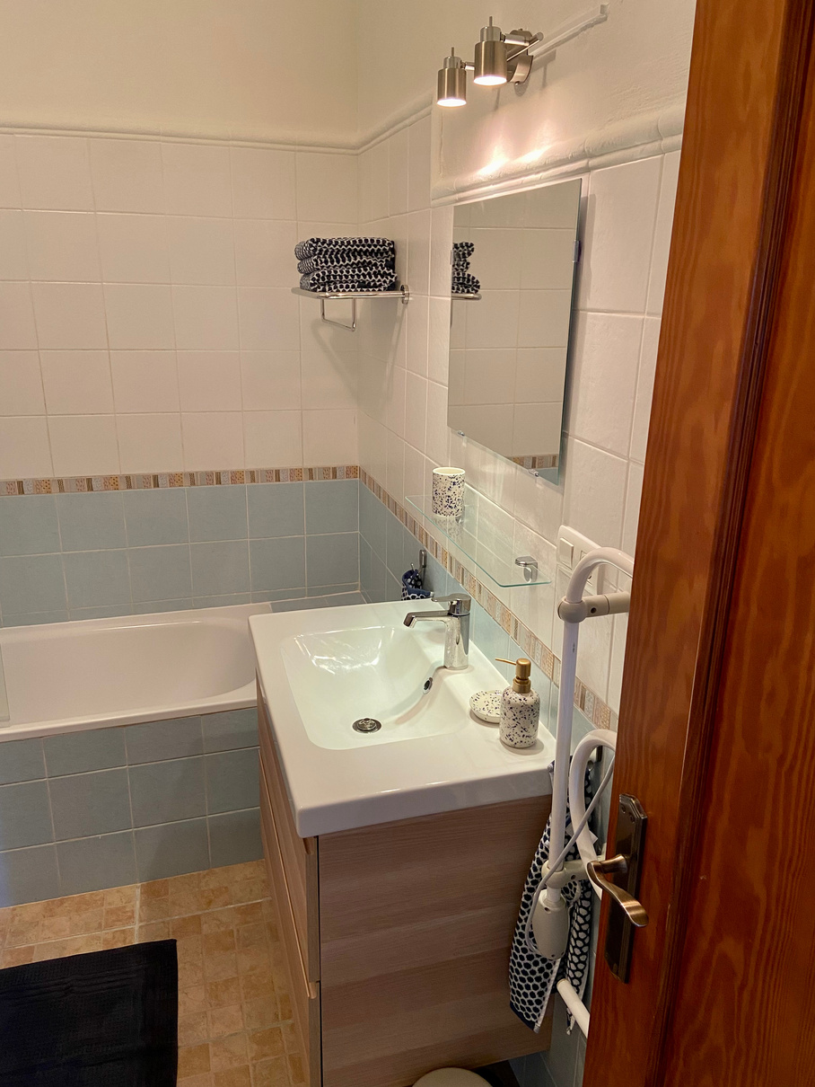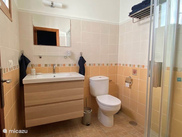 Dit is de grote losse badkamer met wastafel, toilet, douche met een ligbad.
